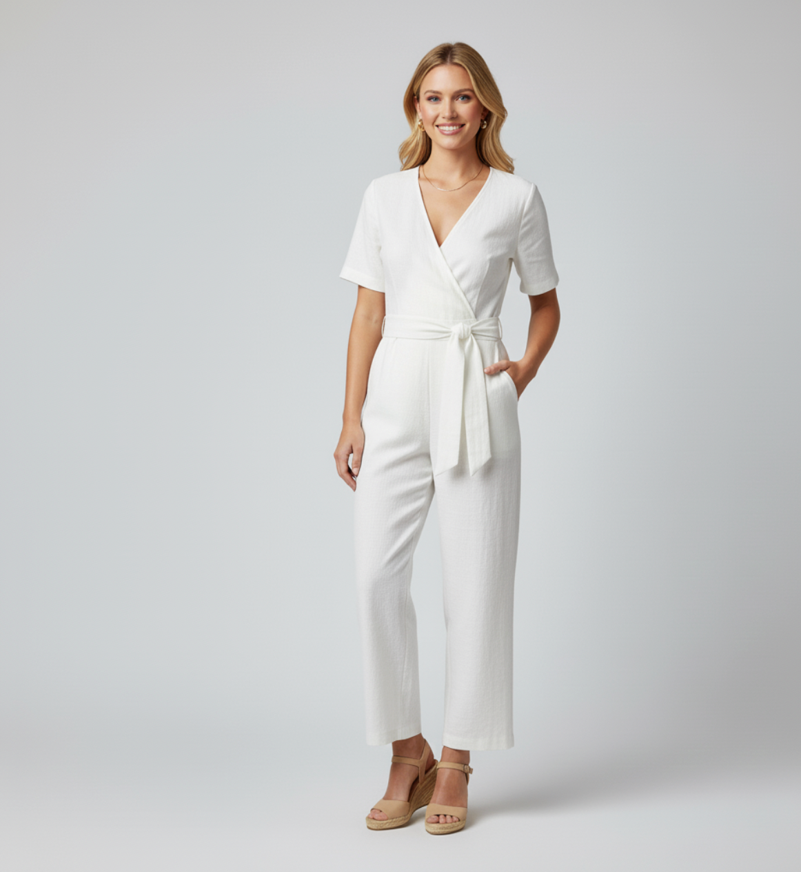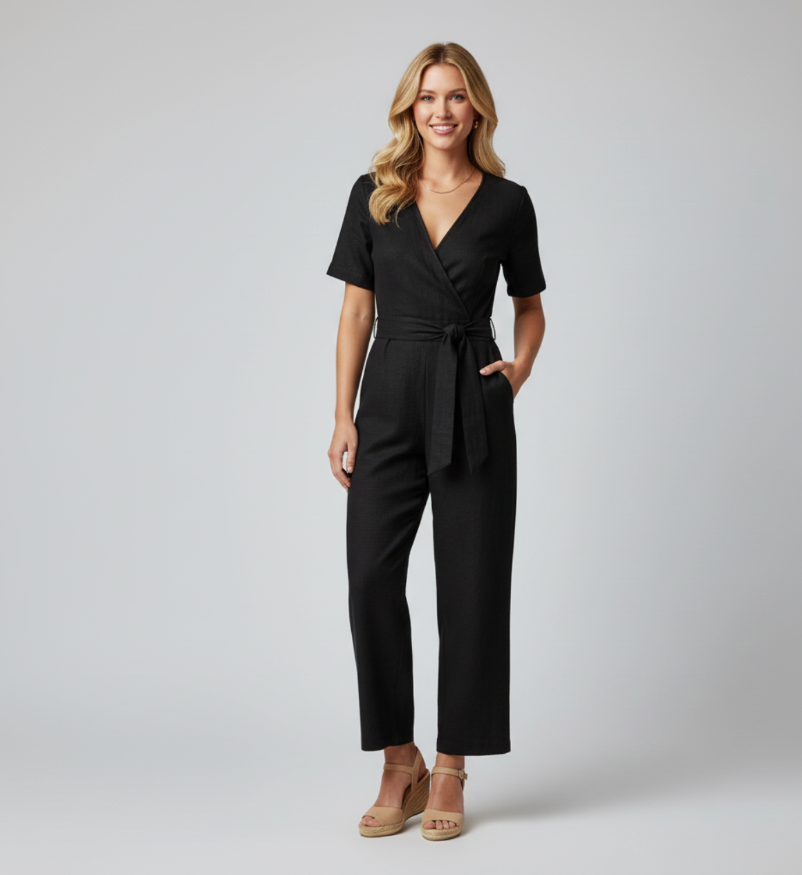 Bring modern polish to your wardrobe with a streamlined one-piece. The wrap-front detail with a tied belt creates a flattering outline for any occasion. From casual outings to evening gatherings, this jumpsuit transitions with ease.